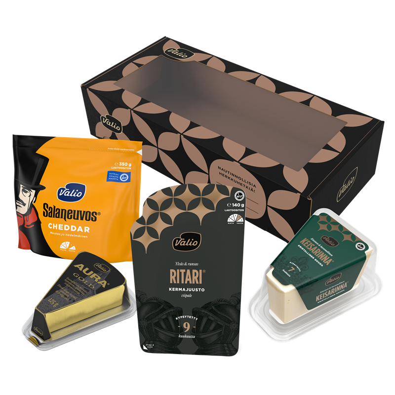 Joulun juustoisin lahja on täydellinen yhdistelmä pehmeyttä ja voimakkuutta. Valio musta juustopakkaus on laadukas mutta vaivaton lahja, joka sopii mainiosti myös joulun ajan tuliaiseksi. Lahjapakkaus... sisältää neljä huolella valittua juustoa, jotka ilahduttavat taatusti juustonystävää: Valio AURA® Gold, Valio Ritari® viipale, Valio Keisarinna® ja Valio Salaneuvos® Cheddar. Juustojen seuraan sopivat esimerkiksi Valio glögi, piparit, hedelmät ja hillokkeet. Joulun 2025 kausituote. Näytä lisää