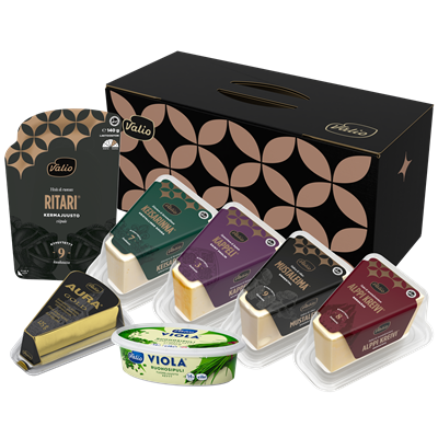 Joulun juustoisin lahja voimakkaiden makujen ystävälle! Valio punainen juustopakkaus on laadukas mutta vaivaton lahja, joka sopii mainiosti myös joulun ajan tuliaiseksi. Lahjapakkaus sisältää kolme huolella... valittua juustoa, jotka ilahduttavat taatusti juustojen ystävää: Valio Mustaleima™, Valio AURA® ja Valio Viola® kolme pippuria tuorejuusto. Juustojen seuraan sopivat esimerkiksi Valio glögi, piparit, hedelmät ja hillokkeet. Joulun 2025 kausituote. Näytä lisää