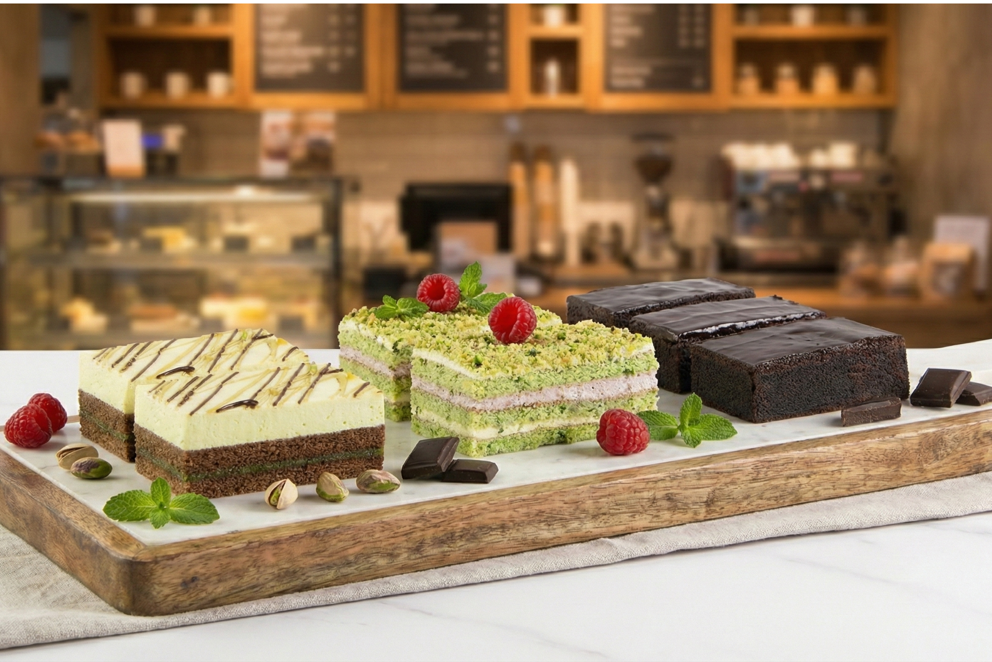 Pistaasijogurttikakku tarjoaa hienostuneemman ja täyteläisemmän vaihtoehdon. Tummasuklaakakkupohjat ja rapea praliinitäyte luovat syvän ja moniulotteisen pohjan, jota vaaleanvihreä pistaasikerma ja jogurttimousse tasapainottavat raikkaudellaan. Tämä kakku sopii erityisesti tilanteisiin, joissa halutaan tarjota jotain hieman ylellisempää ja erottuvaa.