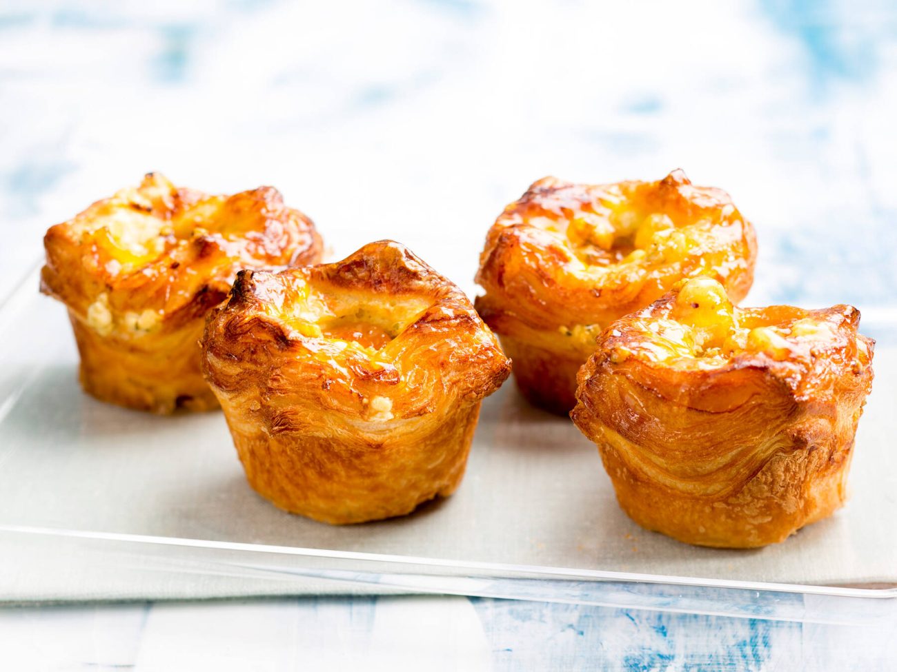 - Kauli levännyt wienertaikina 3 mm:n vahvuiseksi matoksi. Leikkaa matto 8x8 cm:n paloiksi. Pursota sinihomejuustotäytettä palojen keskelle. Nosta kulmat ylös ja aseta palat Al- foliokapseleihin (pohjan Ø 55 mm, korkeus 30 mm). Nostata wienerit.
