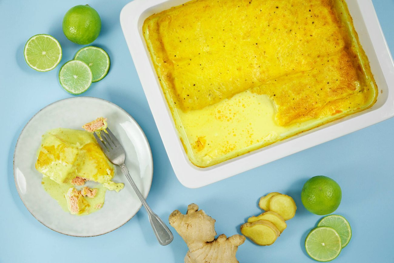 - Annostele lohiannoskalapalat GN-vuokaan. Punnitse Valio Ruoka 15% laktoositon sekä kylmä vesi sekoittavaan pataan tai yleiskoneeseen. Punnitse tärkkelys sekä kuivamausteet samaan astiaan, sekoita. Ripottele tärkkelys-mausteseos hitaasti nesteiden joukkoon voimakkaasti samalla yhteen suuntaan sekoittaen. Lisää Valio Koskenlaskija® sulatejuusto, limemehu sekä inkivääritahna joukkoon. Sekoita kastike tasaisesti. Annostele kastike kalapalojen päälle. Paista kuivapaistolla 115 asteessa noin 45 minuuttia. Anna vetäytyä ennen tarjoilua.