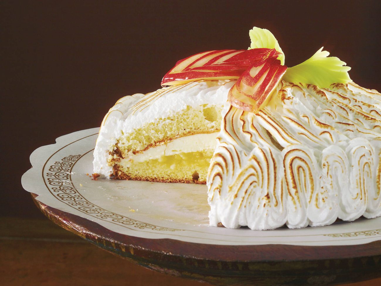 - Vaahdota valkuaiset ja lisää 120 asteiseksi keitetty sokerivesi. Vispaa kunnes seos on jäähtynyt. Pursota marenki kakkujen päälle. Polta marenkia hieman puhalluslampulla. Koristele omenaviipaleilla.