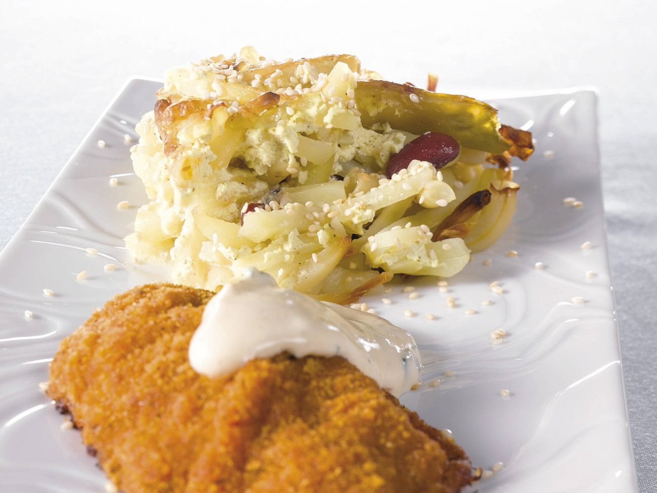 - Levitä kasvikset voideltuun GN 1/1-65 -astiaan. Sekoita muut ainekset keskenään ja kaada kasvisten päälle. Kypsennä kiertoilmauunissa 175 asteessa 45 min. Ripottele pinnalle paahdettuja seesaminsiemeniä