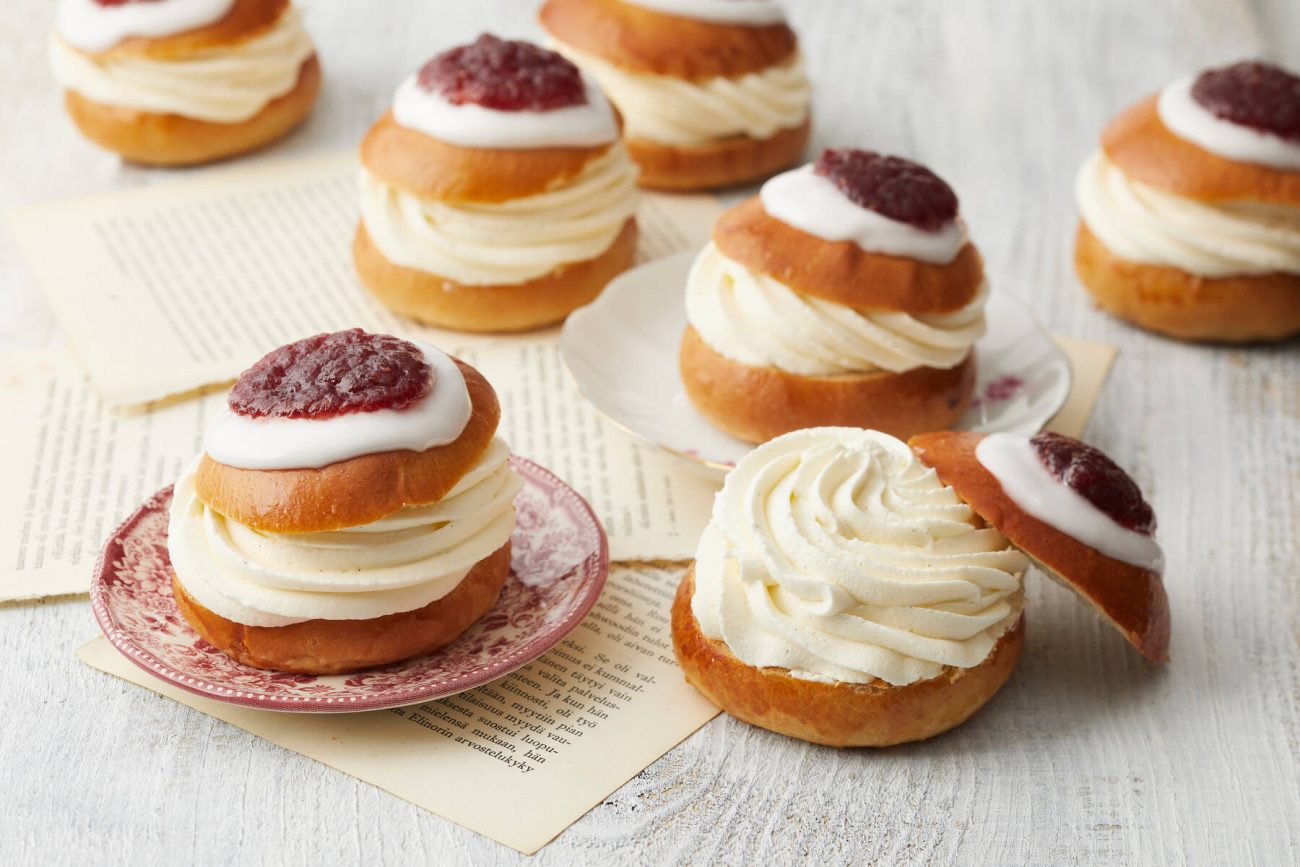 - Voitele pullat kananmunalla. Paina keskelle kuoppa ja pursota vadelmatäyte keskelle. Paista pullat 210 asteisessa uunissa n. 10 minuuttia.