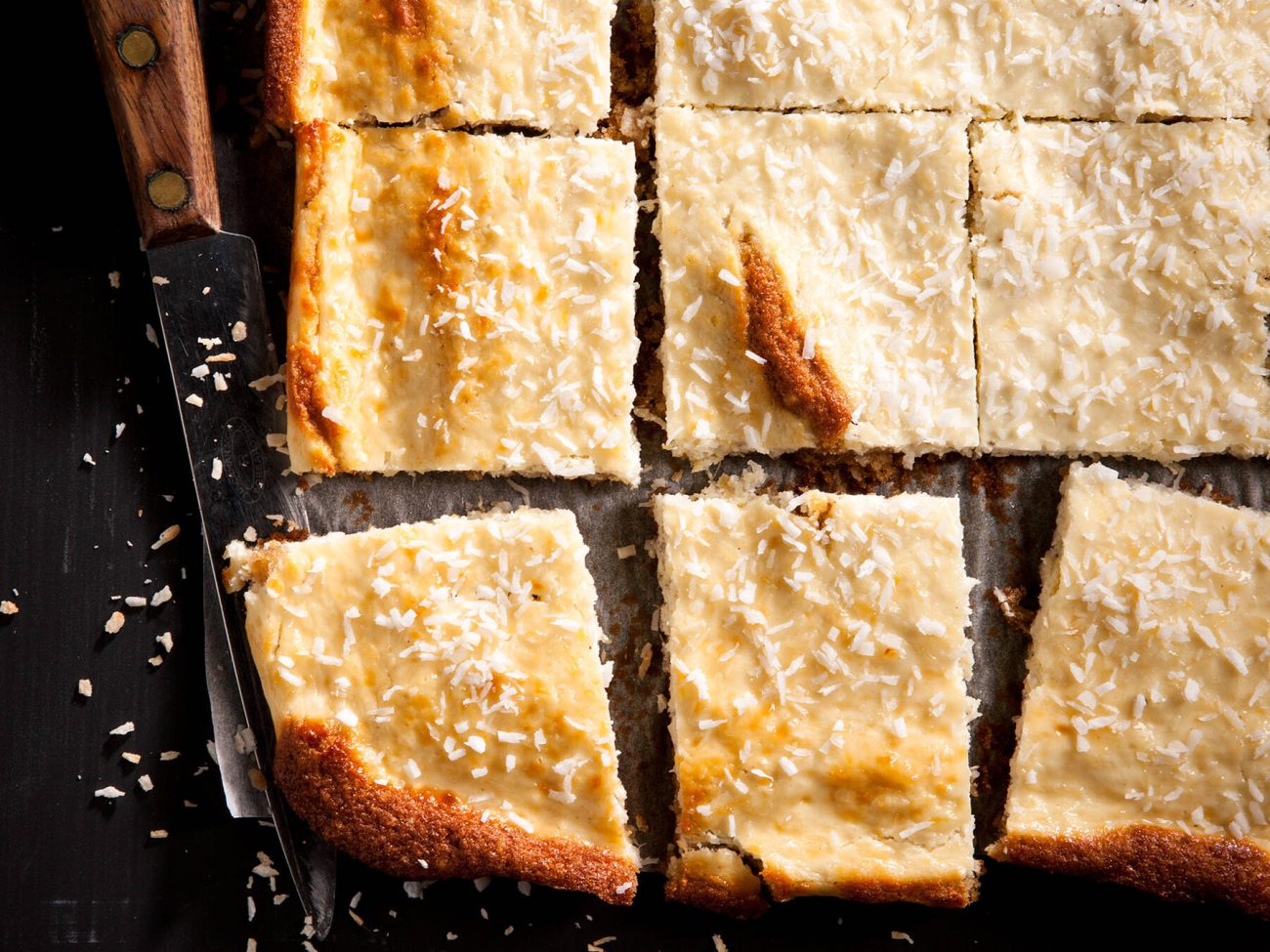 - Valmista täyte: sekoita rahka, sokeri ja munat. Pese ja raasta sitruuna ja purista siitä mehu. Lisää täytteeseen. Levitä täyte pohjan päälle. Ripottele kookoshiutaleet pintaan.