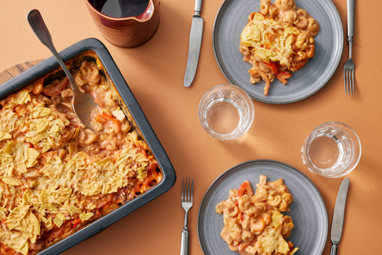 - Annostele massa GN-vuokiin. Ripottele pinnalle ennen paistoa murennettuja nacho-chipsejä sekä Valio juustoraasteseosta. Paista yhdistelmäpaistolla 130 asteessa noin 50 minuuttia, ruskista tarvittaessa lopussa 5 minuuttia kuivapaistolla 160 asteessa. Anna vetäytyä ennen tarjoilua.