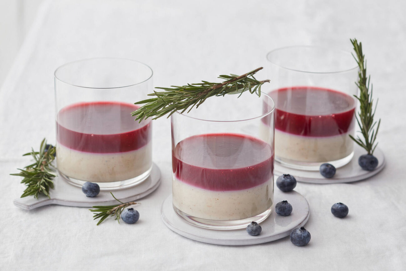 - Nouki (tai siivilöi) rosmariini pois kiisselistä ja kaada kiisseli vaalean kiisselin päälle annoskippoihin. Jäähdytä kylmäksi.