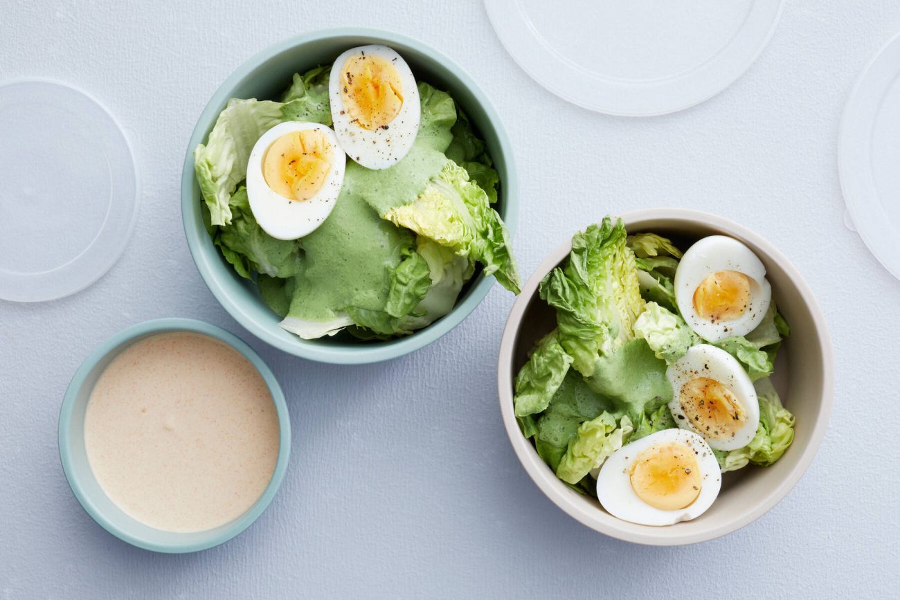- Sekoita kermaviili, vesikrassi, kapris, yrtit, etikka ja mausteet tasaiseksi tehosekoittimessa. Kokoa salaatti sydänsalaatista, kananmunista ja kastikkeesta.
