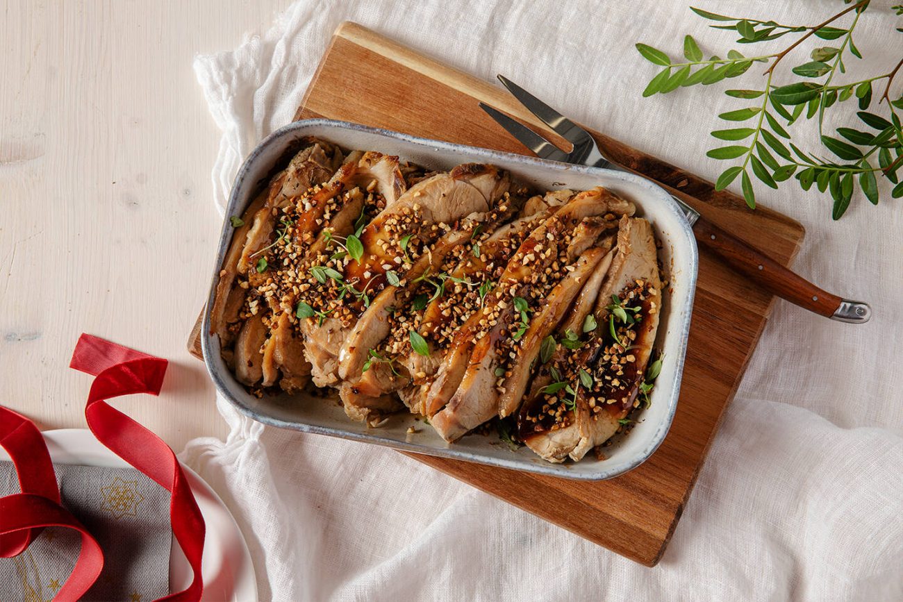 Tänä vuonna joululounaan noutopöydän kunkku, eli joulukinkku glaseerataan herkullisella viskiglaseerauksella ja pinnalle lisätään paahdettua joulumausteilla maustettua mantelirouhetta.