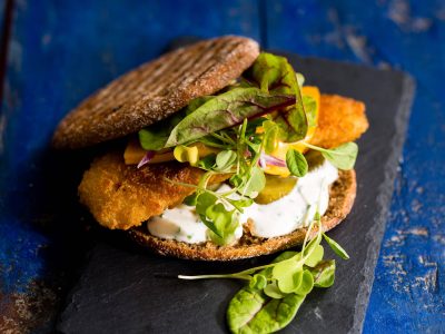 Paneroitu kalafilee, joka on maustettu yrteillä ja limellä.